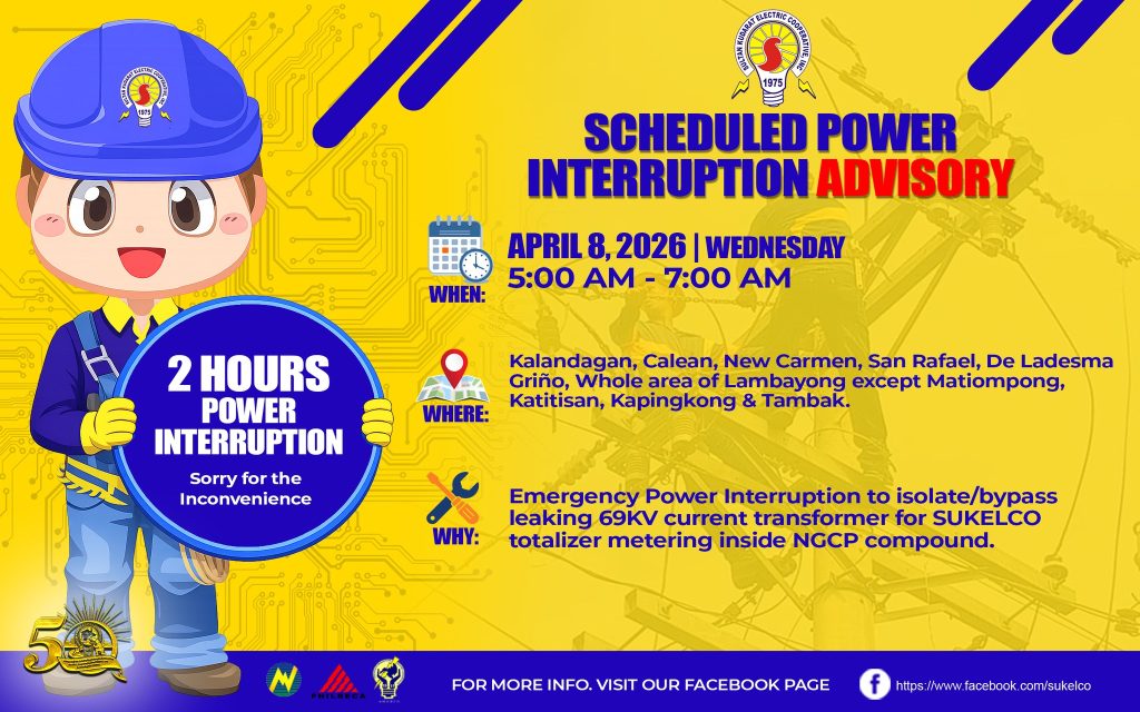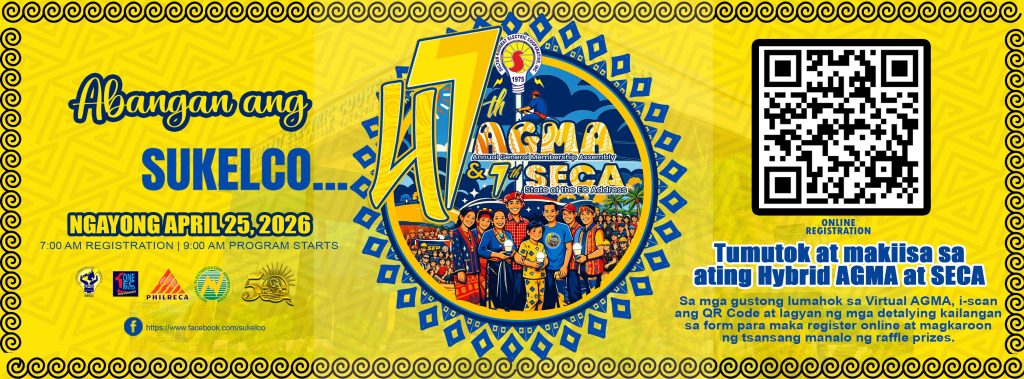 SULTAN KUDARAT ELECTRIC COOPERATIVE, INC. (SUKELCO) was organized pursuant to Presidential Decree No. 269, as amended to implement the government’s national policy of total electrification of the country on an area coverage basis. It is a non-stock, non-profit oriented entity, providing adequate and reliable electric service to its consumers.